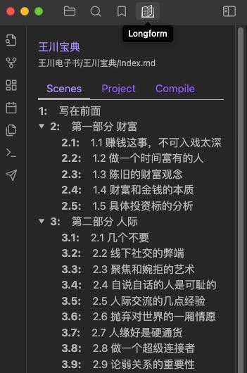 Obsidian上手需要点时间,不过如果你熟悉Markdown语言应该很快。它的强大来自于可以关联不同的单页笔记,开发者社区还有不同的插件可供使用。为了编写这本书我需要把之前散落的文章串联成不同的章节,只需要安装Longform这个插件就可以把散落的章节排成目录,并且最终compile成一个完整的.md file,因此得名Longform。