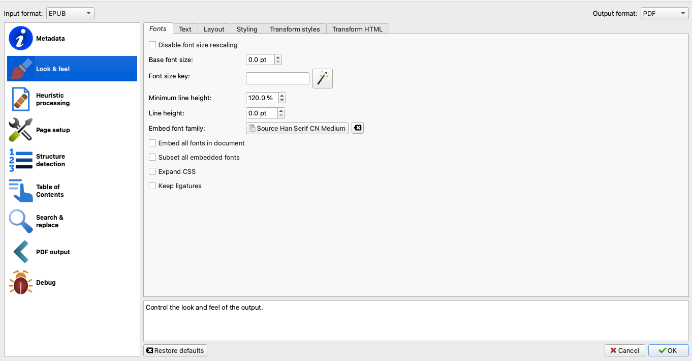 想要调整pdf的字体:就在Look&Feel里Insert font,上传.tff字体文件。在尝试了十个不同的字体后我最终选择思源宋体Source Hans Serif,可去官方下载,注意查看字体是否可免费商用。