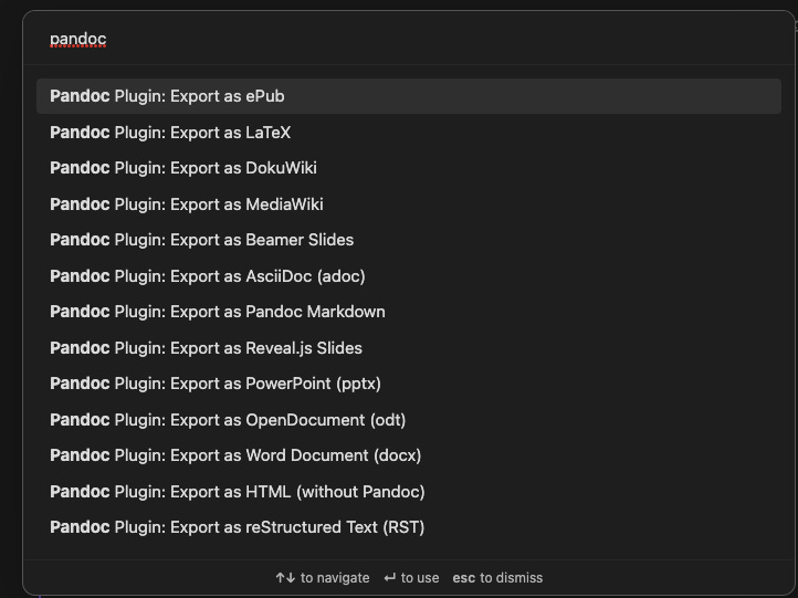 打开上一步Longform中生成的最终markdown file,Mac按Command+P会弹出搜索框,输入“Pandoc”就能选择想要导出的格式。