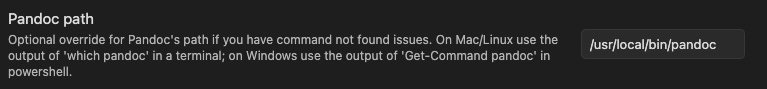 which pandoc然后会得到一个"/usr/local/bin/pandoc"的路径,需要把这个路径复制到Pandoc Plugin Path里才能正式启用。