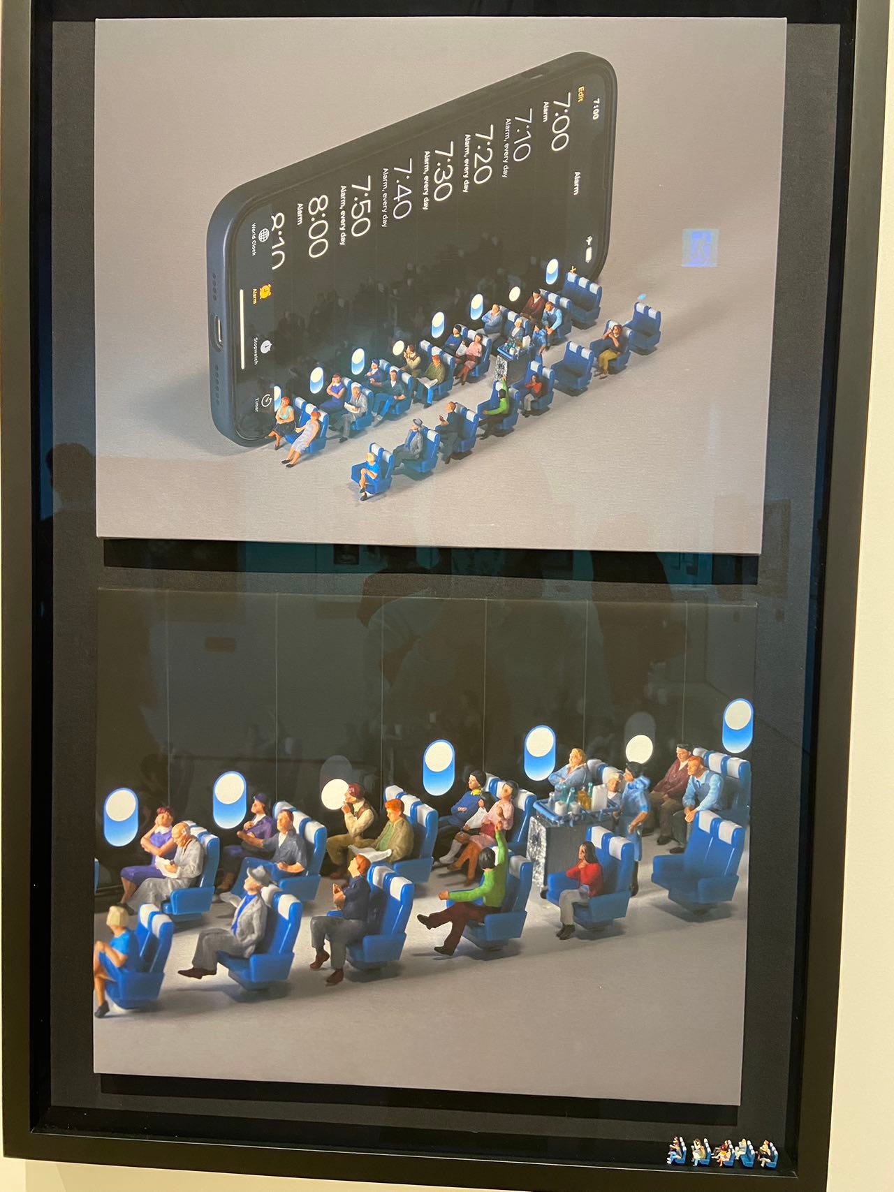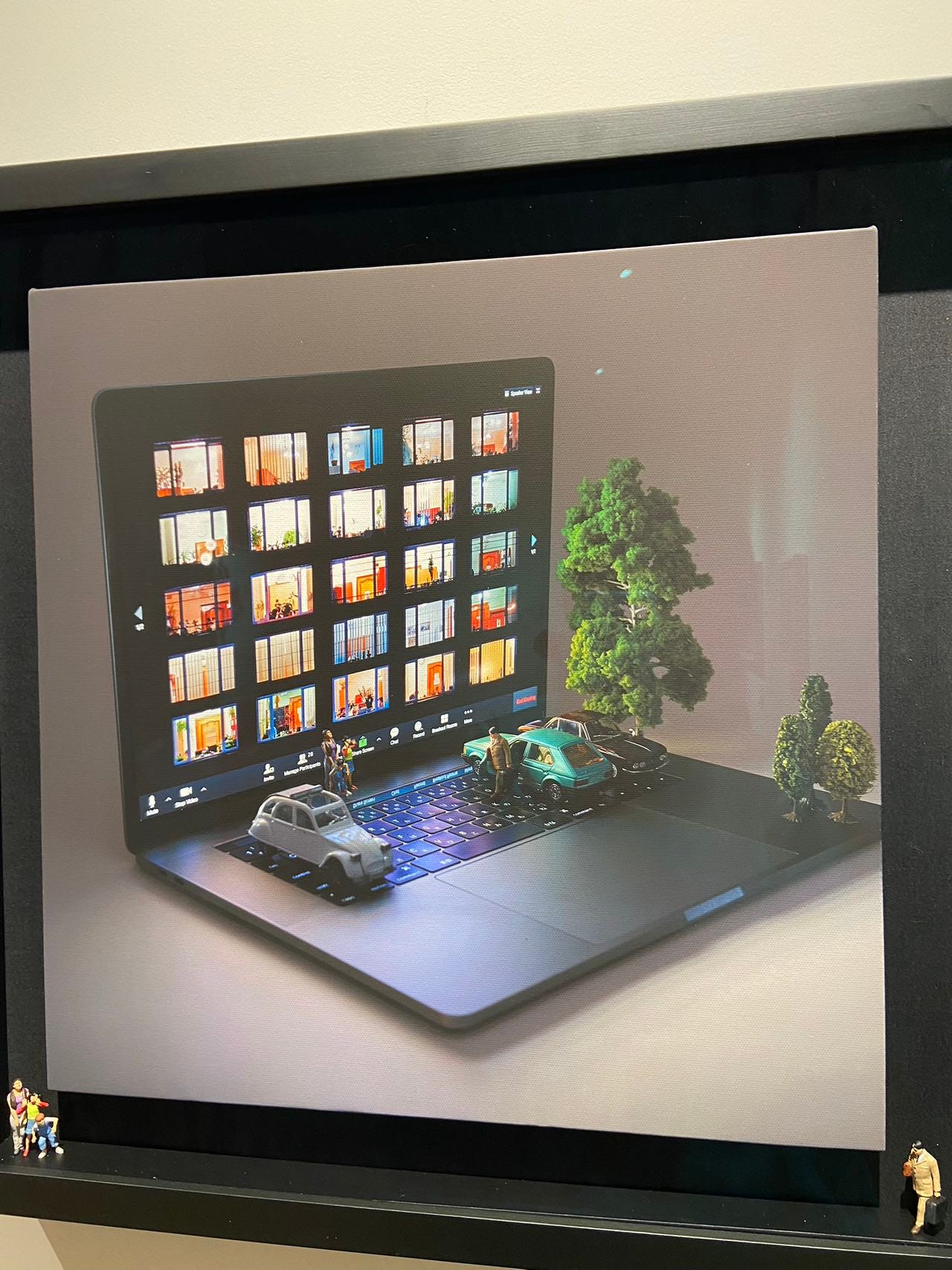 和想象中艺术家对现代科技的排斥不同,这位艺术家非常善用现代科技。他的微雕人物是3D打印出来再上色的。他甚至按照职业特征收纳这些小人,至今为止累计有10万多件。他还给自己规定每天早上七点要发社交媒体内容,和村上春树一个调调,我这种三分钟热度的人看到这种持之以恒的人真是牙痒痒。所以他在自己的作品中也融入了很多手机和电脑键盘的符号。