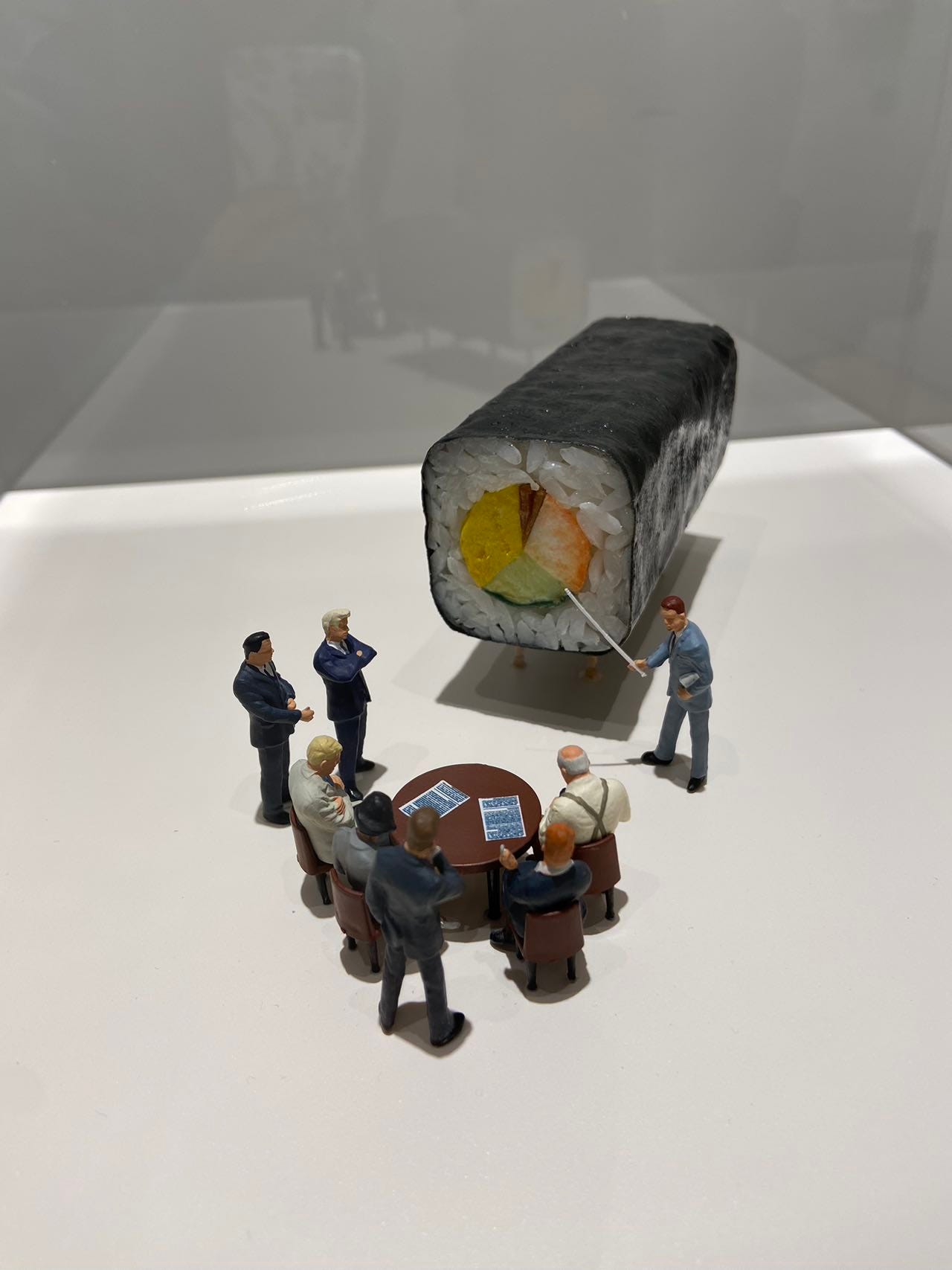三月去看了Tanaka Tatsuya的微雕展。一直对miniature非常感兴趣,看到那么多个展品,每个都自成一个世界,深刻体会到了“一花一世界”和“见微知著”的厉害。这位艺术家善于在日常事务中看到更深刻的含义,比如寿司的横切面就像开会时的饼图。
